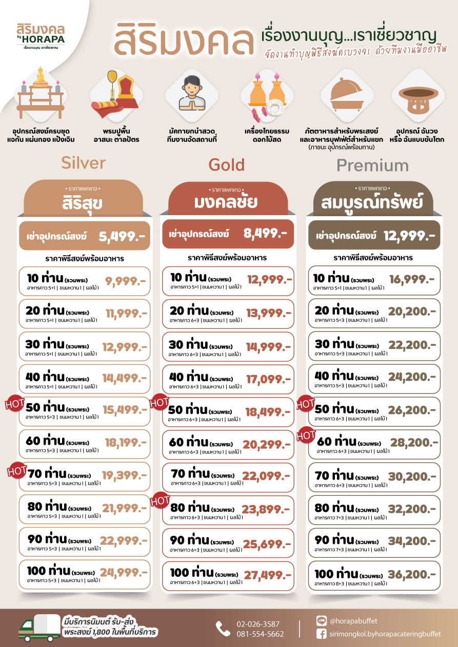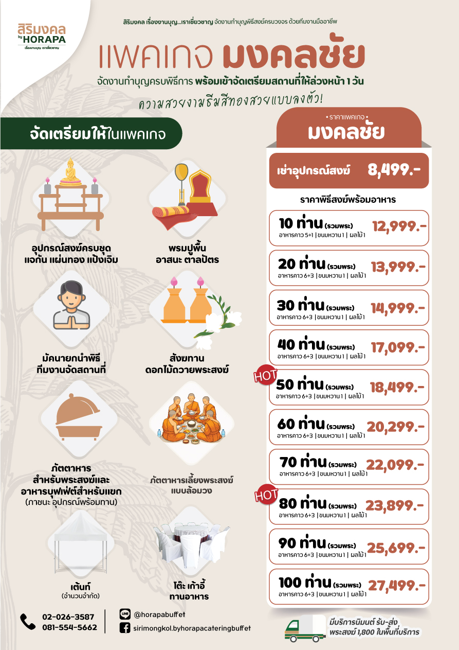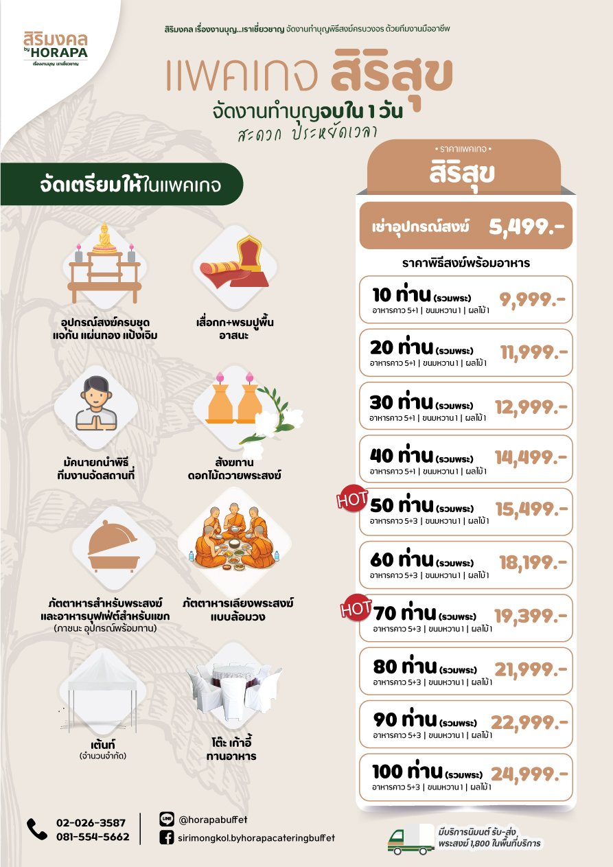 "สิริมงคล เรื่องงานบุญ...เราเชี่ยวชาญ " รับจัดงานทำบุญ ราคาเริ่มต้น 4,999 บาท ทำบุญบ้าน ทำบุญขึ้นบ้านใหม่ ทำบุญบริษัท แบบครบวงจร
