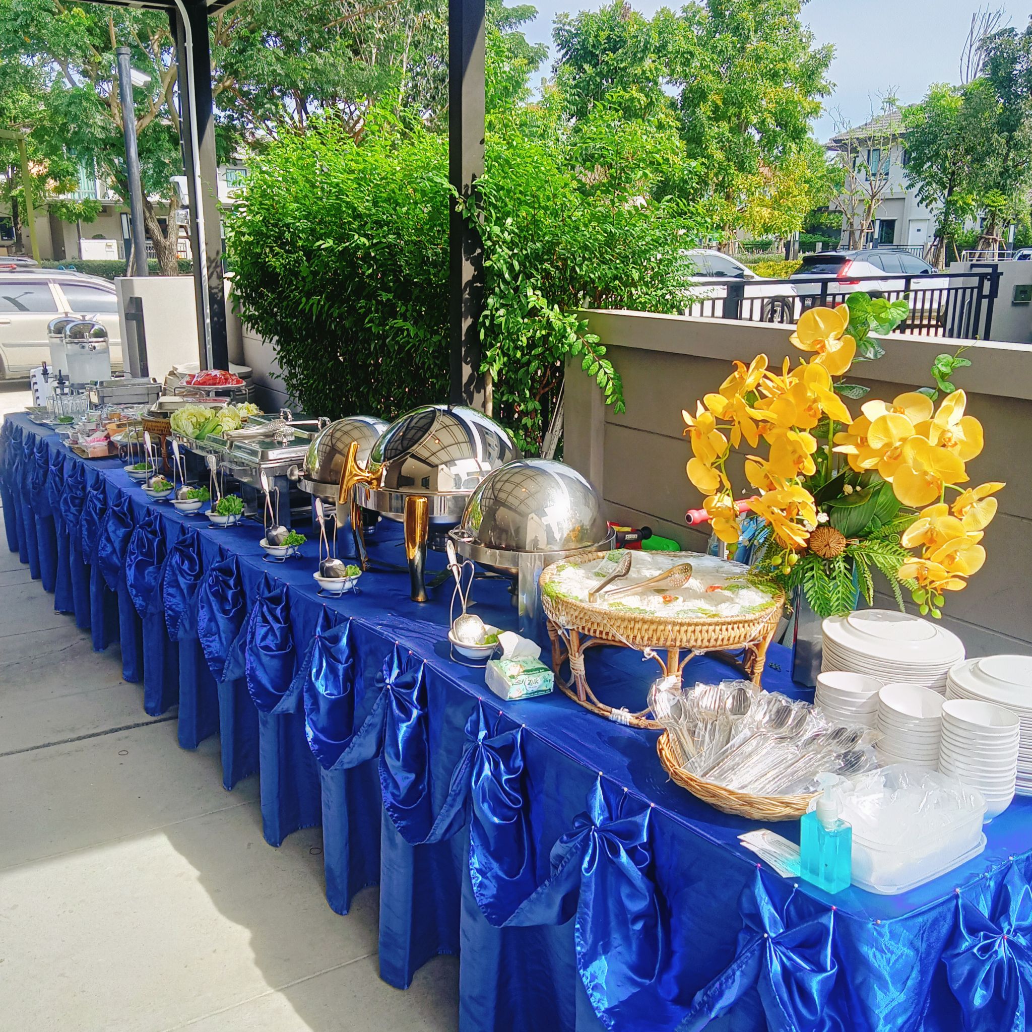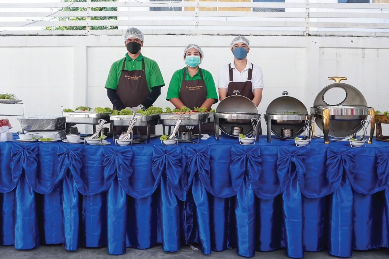 2. ไลน์อาหารประดับด้วยดอกไม้  จีบผ้าสวยงาม  อุปกรณ์การจัดเตรียมอาหาร  พร้อมคูเลอร์น้ำเย็นแบบกด